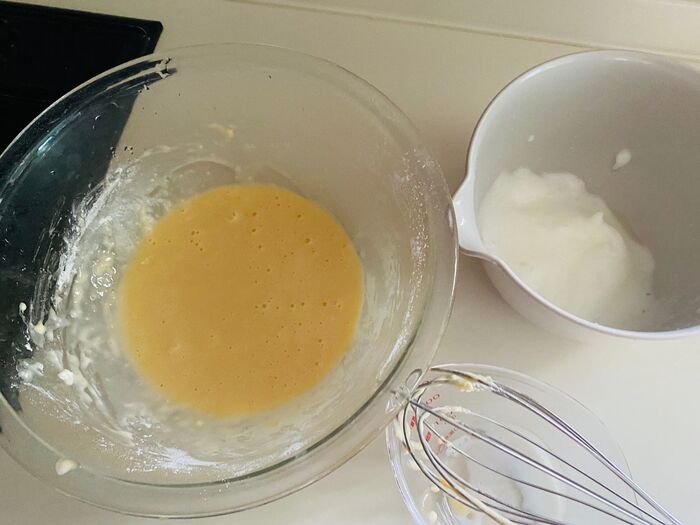 ④そこに、角が立つまでよく撹拌した卵白を入れさっくりさっくり混ぜます。