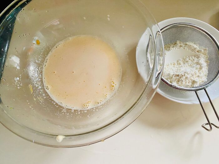 ふるいにかけながら小麦粉、ベーキングパウダーを入れよく混ぜます。