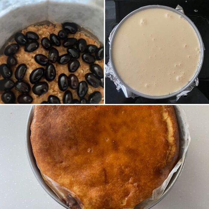 ビスケットを敷き詰めた型の上に黒豆をちらし、生地を流し入れ