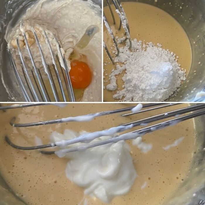 卵黄、卵を1個ずつ加え、そのつどよく混ぜ合わせ、米粉を加え