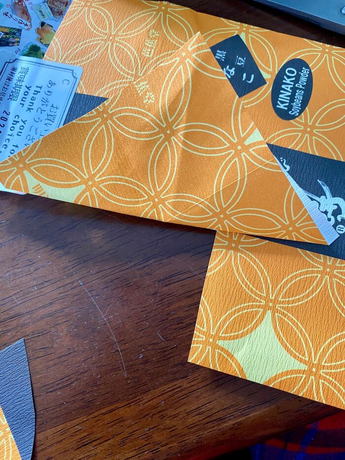 家にあった和風の包装紙を台座になるように適当な形にハサミでカットして貼ります。