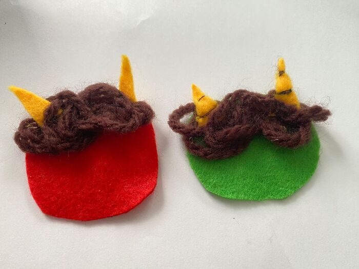 家にあった赤と緑のフェルトを鬼の顔の形に切って、黄色いフェルトを三角に切り角を作り縫い付けます。