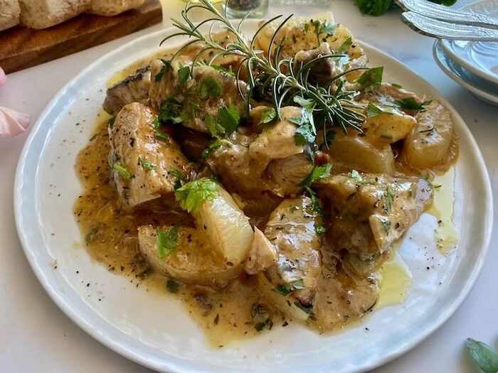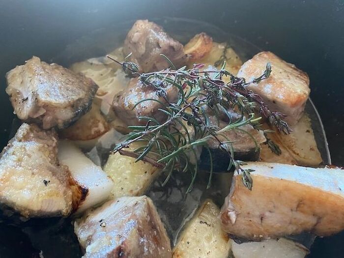 残りのオリーブオイルを入れ、大根をこんがりと焼き、ぶりのアラを戻してローズマリー、タイム、だし汁、残りの白ワインを入れる。