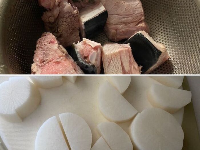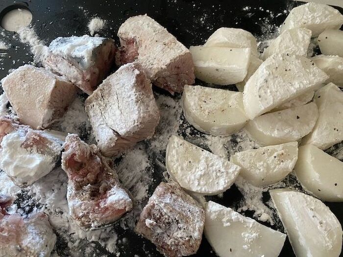 ぶりのアラと大根に塩と黒コショウ、片栗粉をまぶす。