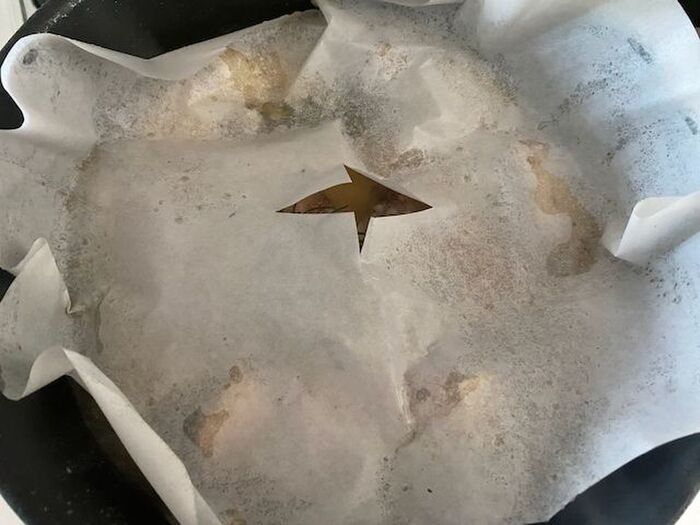 沸騰したら弱火にして、クッキングペーパーで落とし蓋をして10分〜煮込む。