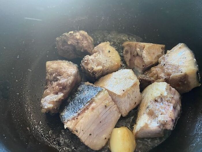 フライパンに、オリーブオイル大さじ1と、潰したにんにく、ぶりのアラを入れ、全体に焼き色をつけ、白ワインの半量をふって、強火にして絡ませ一旦取り出す。