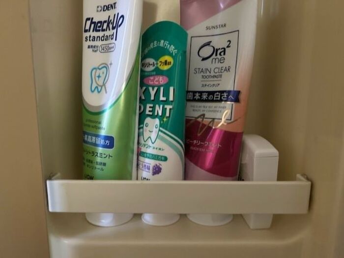 棚板の両端が少しカーブしていて不安定なためか、右はしに置いているフロスが、歯磨き粉を取り出すたびに倒れてくるんです。