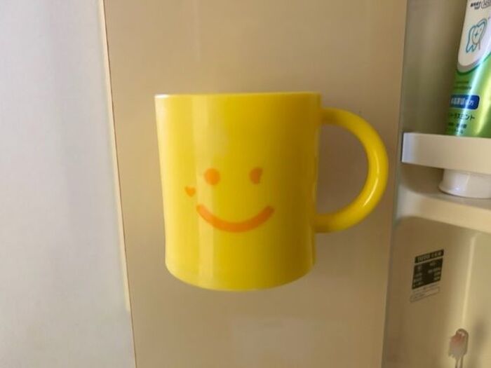 ちなみに、他にも色々くっつけられるかなと、試しにコップをくっつけてみたところ、ピタッとつきました。
