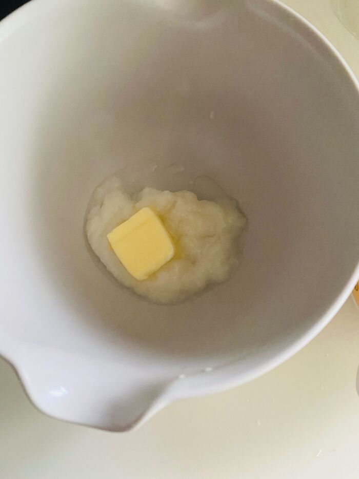 ボールに水気を切った熱々のお餅、バターを入れよく混ぜます。