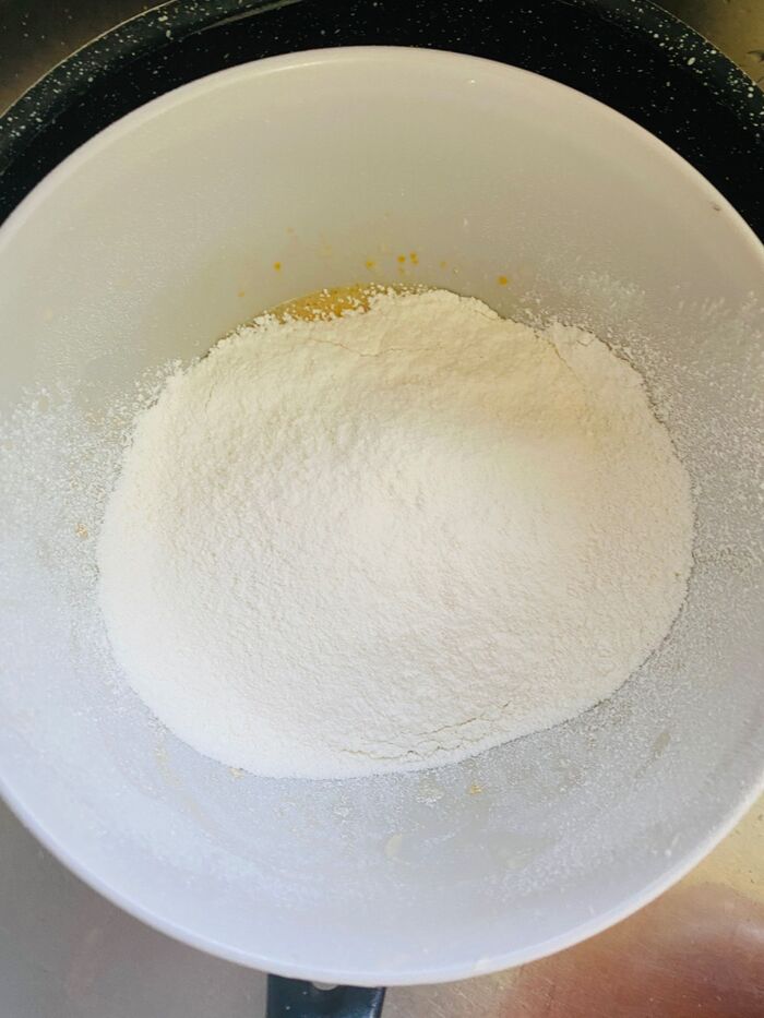 次に小麦粉、ベーキングパウダーをふるいにかけながら加えます。