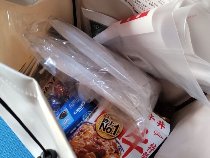 避難場所では、水やおにぎりなどの炭水化物類は、時間が経過すると共に、配給されることもあったりすると思うので(その時で状況は変わりますが・・・)、水は、命を繋ぐだけの分、大きなボトルを1本だけ入れておくことにしました。