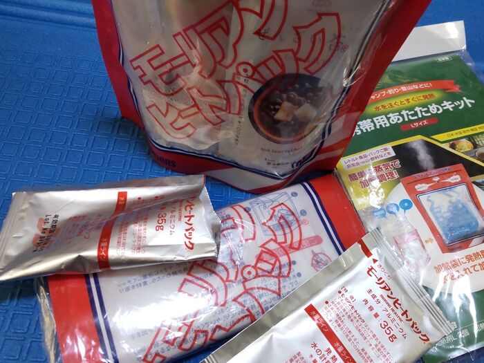 画像左下の赤い袋2枚は、以前購入した防災グッズ一式の中に入っていたモーリアンヒートパック加熱袋です。