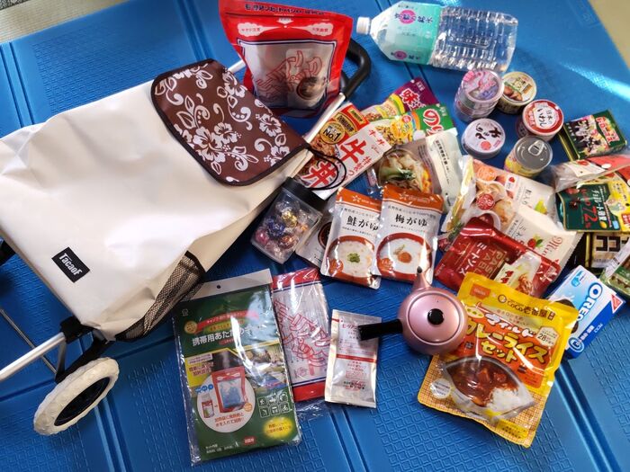 画像は、避難場所にすぐに持って行けるように、自分なりに考えて用意したものなのですが、2輪タイプのアルミ製のショッピングカートに、防災の「食」にまつわるものをまとめて入れてみました。