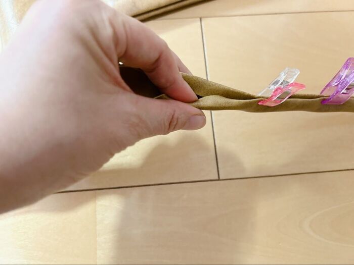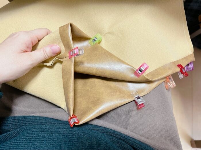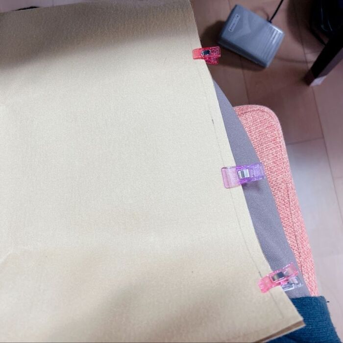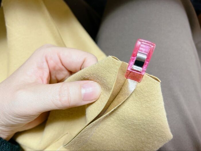 仮止めをする時は生地に穴が開くのを避けるため、クリップで留めて仮止めします。
