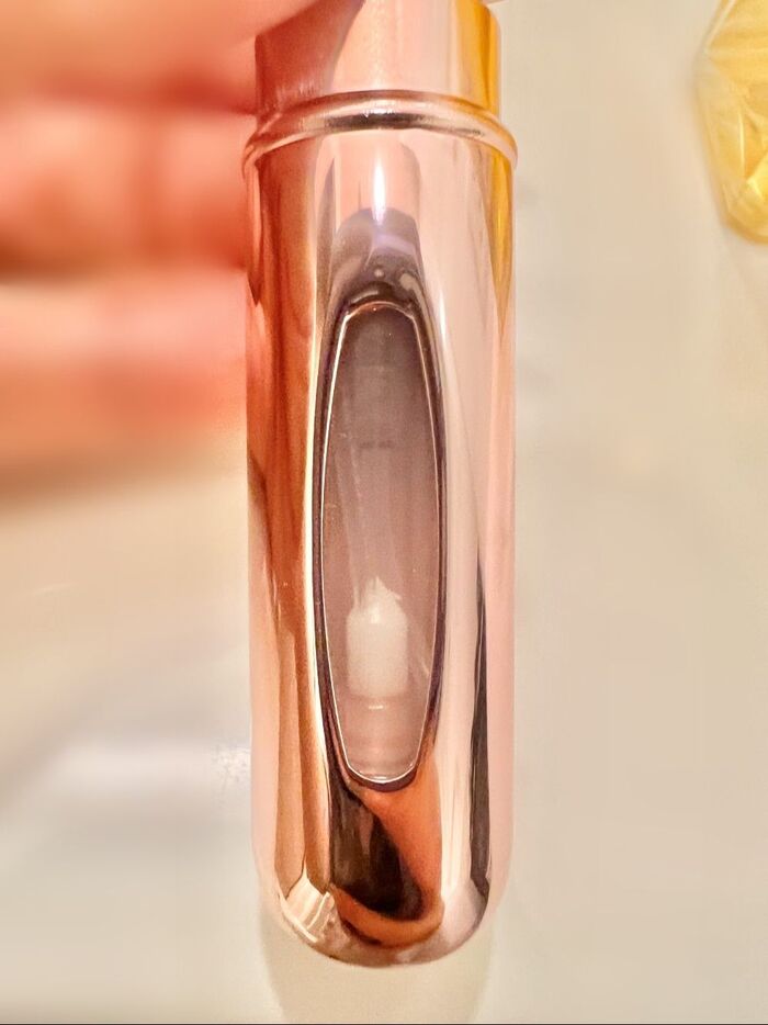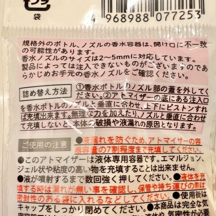 今のところ、使用していても底部から液漏れすることもなく、アドマイザー自体も液詰まりせず、通常のものと同様に霧状で噴出されますので、大好きな香水も簡単に持ち運び可能♪