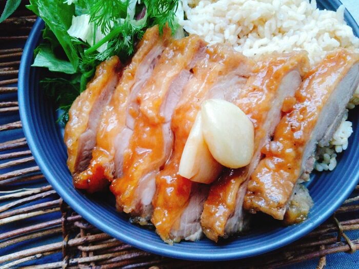 5.鶏肉を食べやすく切ったらサラダ、ご飯と盛り付け残ったタレをかけて完成。