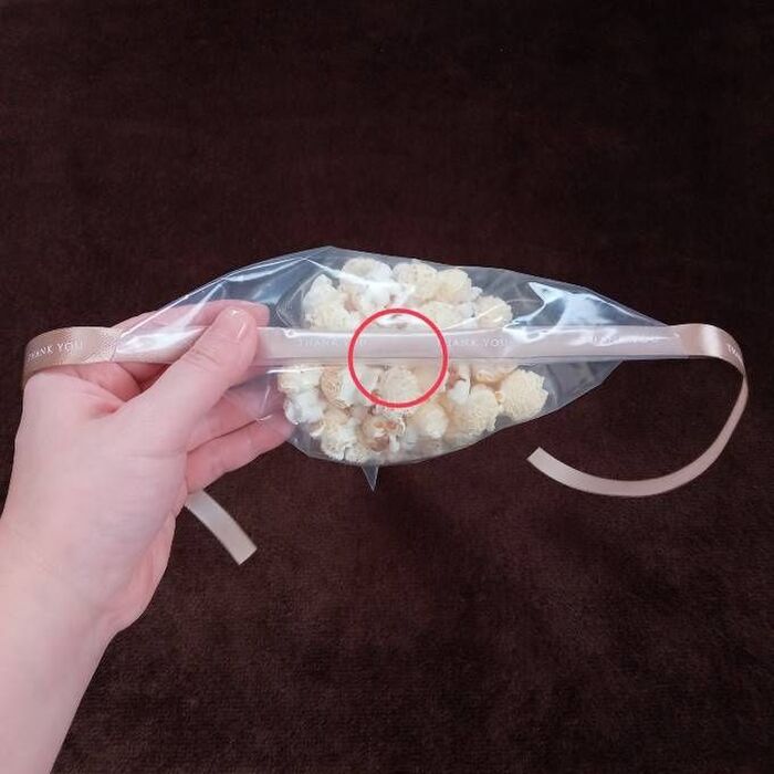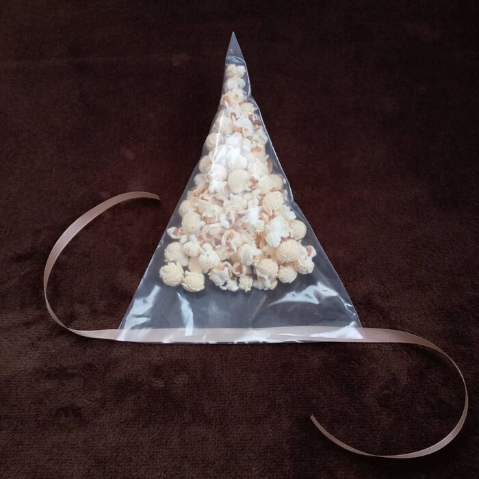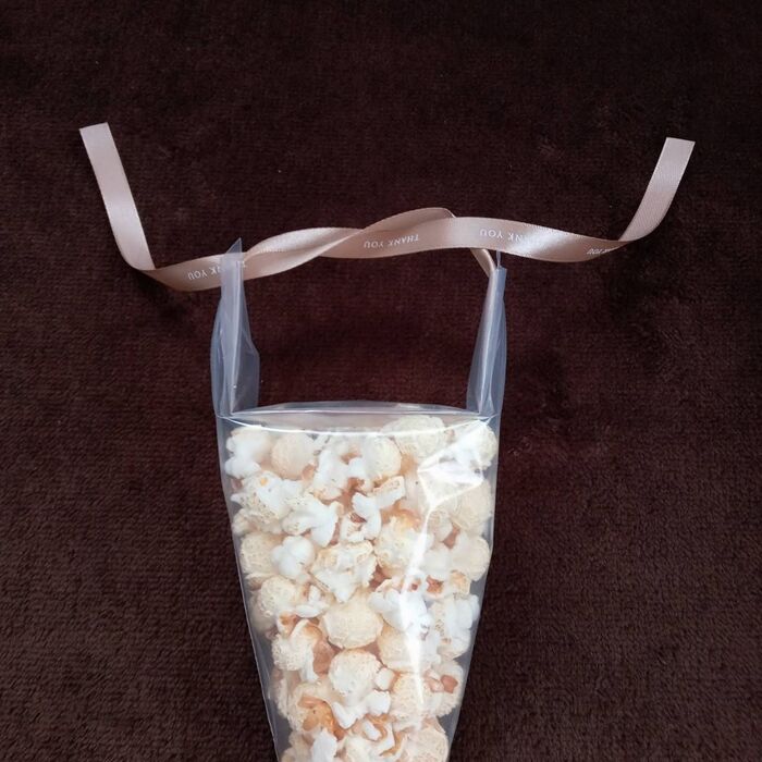 ④おかしなど(ポップコーン)を入れる。リボン端から5cmくらい下までの量にして下さい。数種類のお菓子を層になるように入れても素敵に仕上がります。
