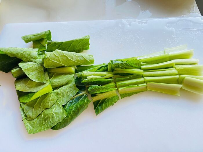 小松菜はよく洗い3cmぐらいのザクザク切りにし、葉側と茎側に分けておきます。