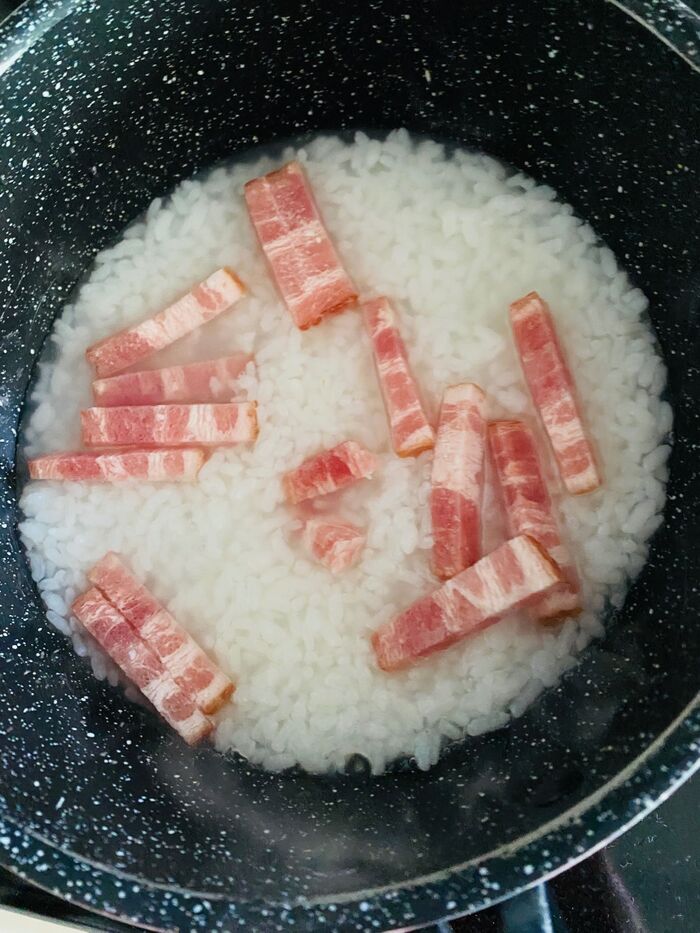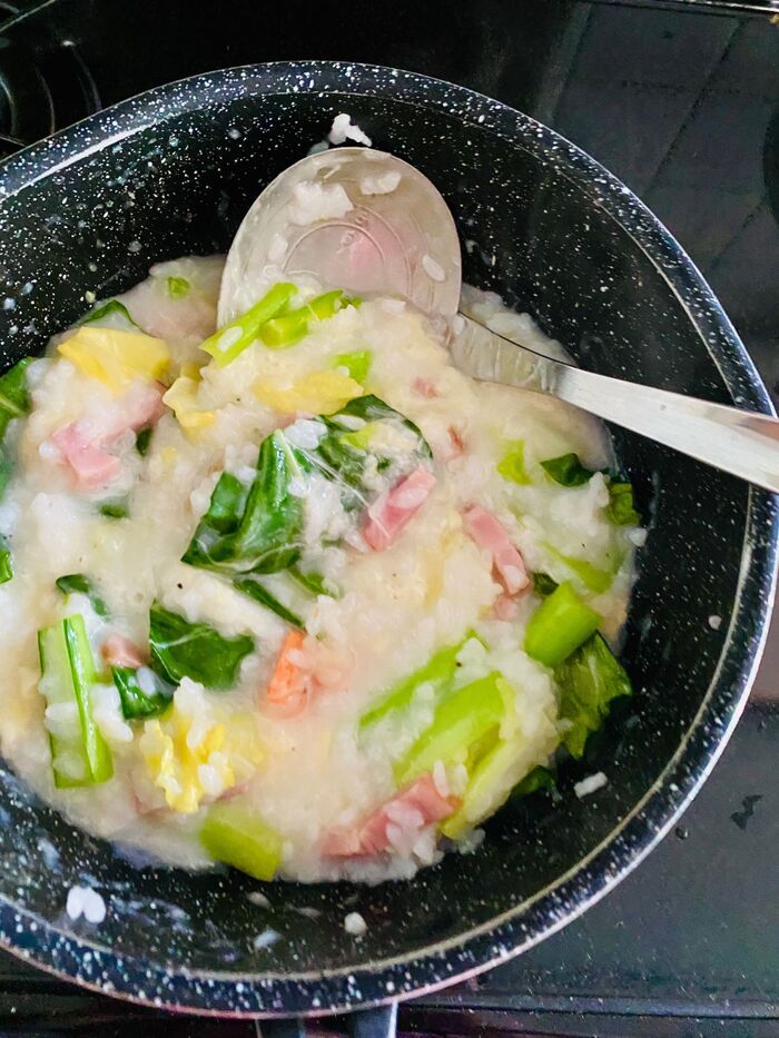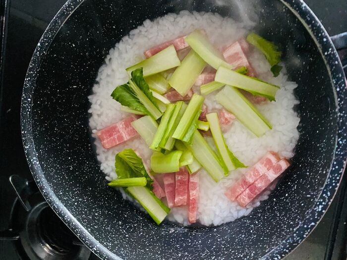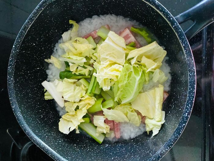 鍋にご飯を入れ、かぶるくらいのお湯を入れよくほぐします。