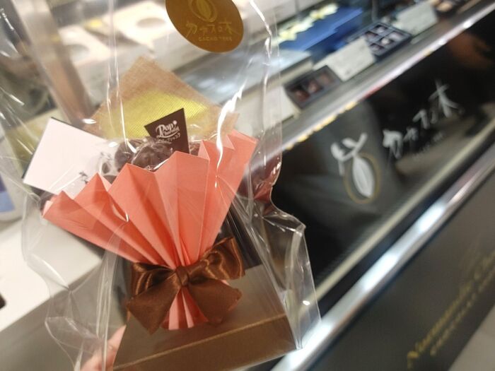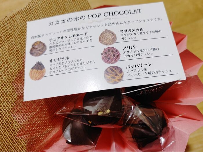 どれもおいしそうでしたが、サロショでしか買えないものをと思い「カカオの木のポップショコラ」(税込3,024円)を購入しました。ブーケのようなラッピングも可愛い♡