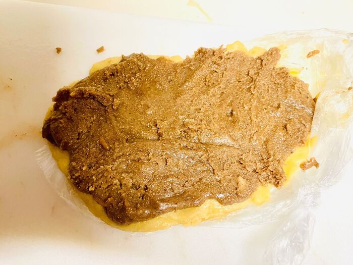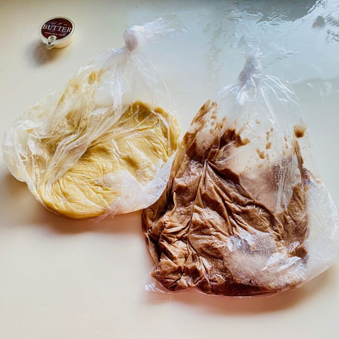 麺棒でビニール袋の上から伸ばします。ビニール袋を外し重ねます。