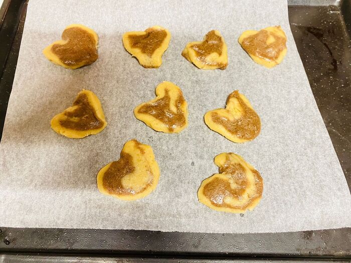 天板にクッキングシートを敷き、スライスした生地をハートの形になるように形成します。
