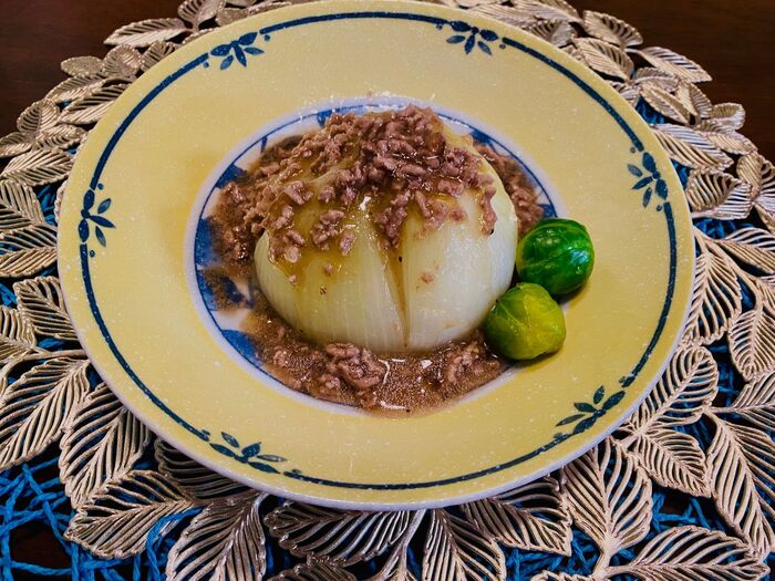 器に新玉ねぎを乗せ、肉そぼろ餡かけをかけます。塩茹でした芽キャベツを飾り完成です。