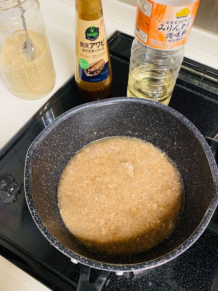 鍋に、油を入れ生姜、豚挽肉を入れて炒め、塩胡椒します。水200ccを入れ、オイスターソース、三温糖、醤油を入れます。最後に水溶き片栗粉を入れとろみをつけ完成!