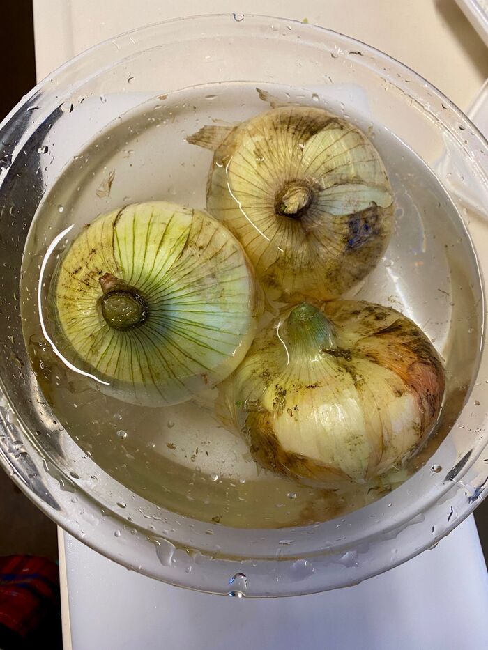 新玉ねぎは、まず少し水に浸します。皮がペロンと剥きやすくなりますよ。