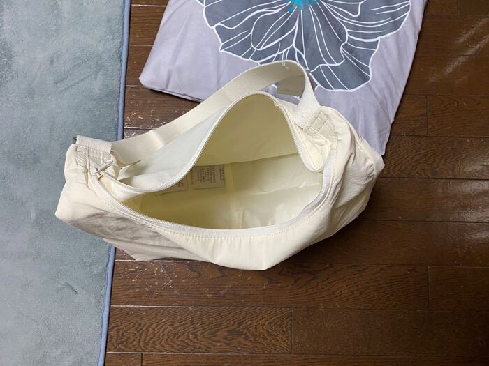 素材は、表地がナイロン100%、裏地はポリエステル100%、付属部分の肩ベルトもポリエステル100%です。