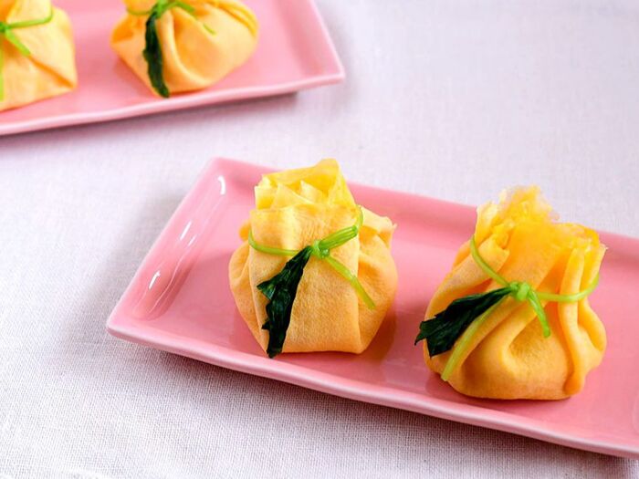 薄焼き卵に手順3.のすし飯を巾着状に包み、三つ葉で止める。