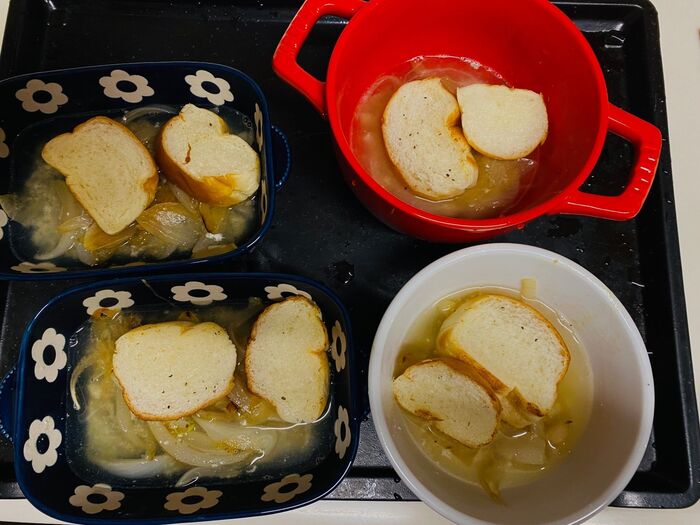 ⑤③に②のチキンスープを注ぎます。④を2個ずつ乗せます。