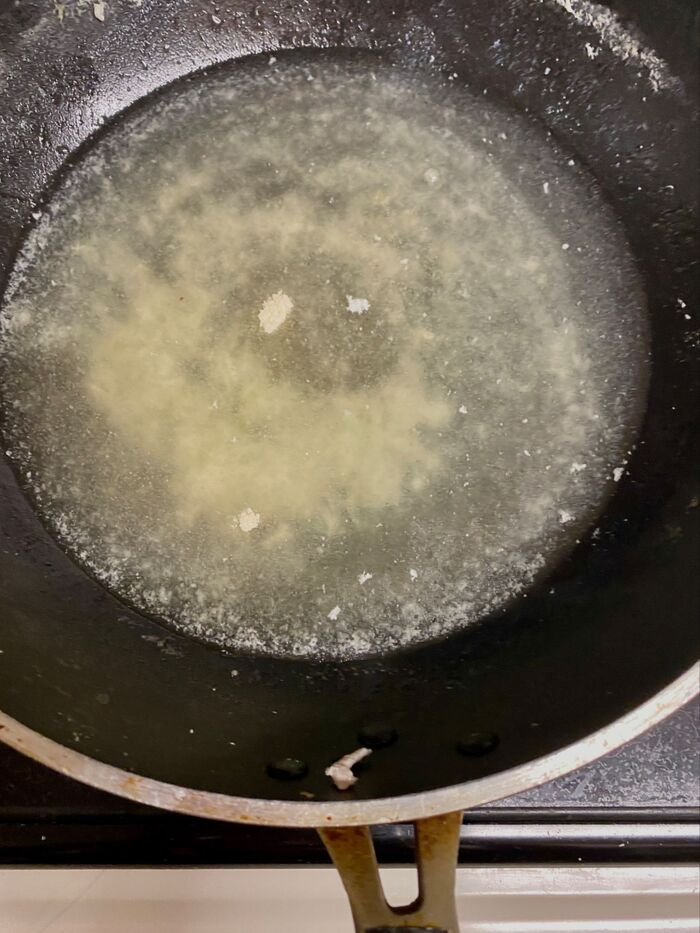 鍋にバターを入れスライスした新玉ねぎを飴色になるまでよく炒めます。