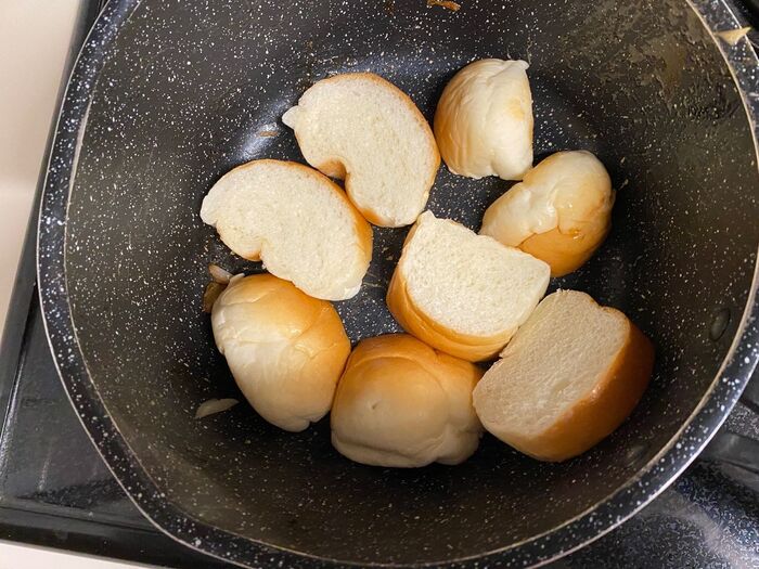 バターロールパンを4等分にスライスして、カリッと焼きます。