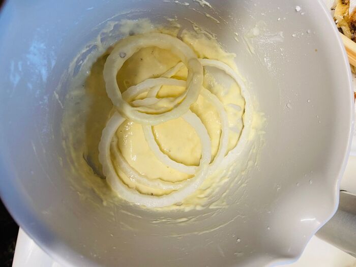 天ぷら粉と水を混ぜて衣を作り、輪切りにした新玉ねぎに衣をつけます。