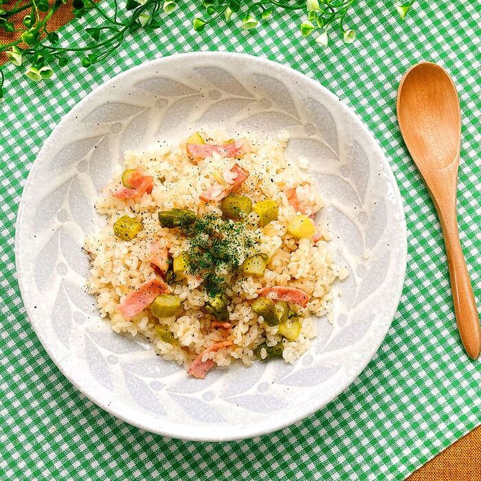 フライパンにバターを入れて中火にかけ、アスパラガス、玉ねぎ、ベーコンを加えて炒め塩を振る。玉ねぎが透き通ってきたら米を加えて2分、バターが米によく馴染むように炒め合せる。