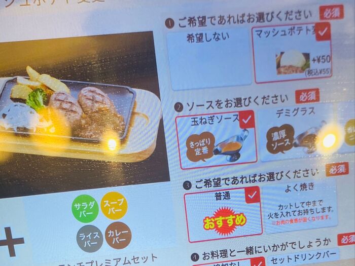 玉ねぎソース、デミグラス、ガーリック、ポン酢などがありました。