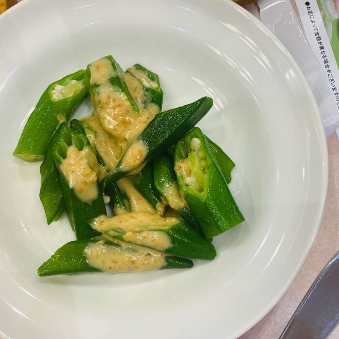 サラダバーでオクラをお皿に乗せて、ごまだれドレッシングをかけました。