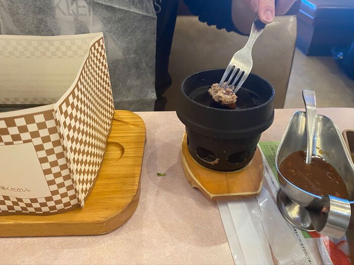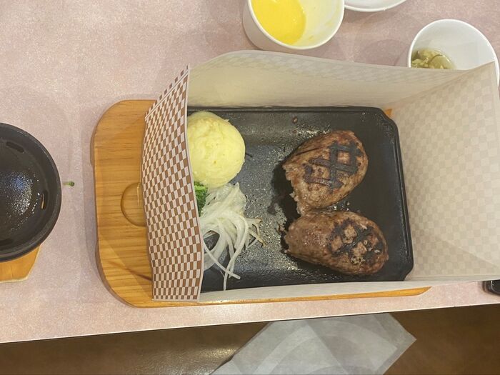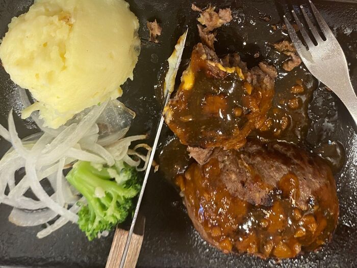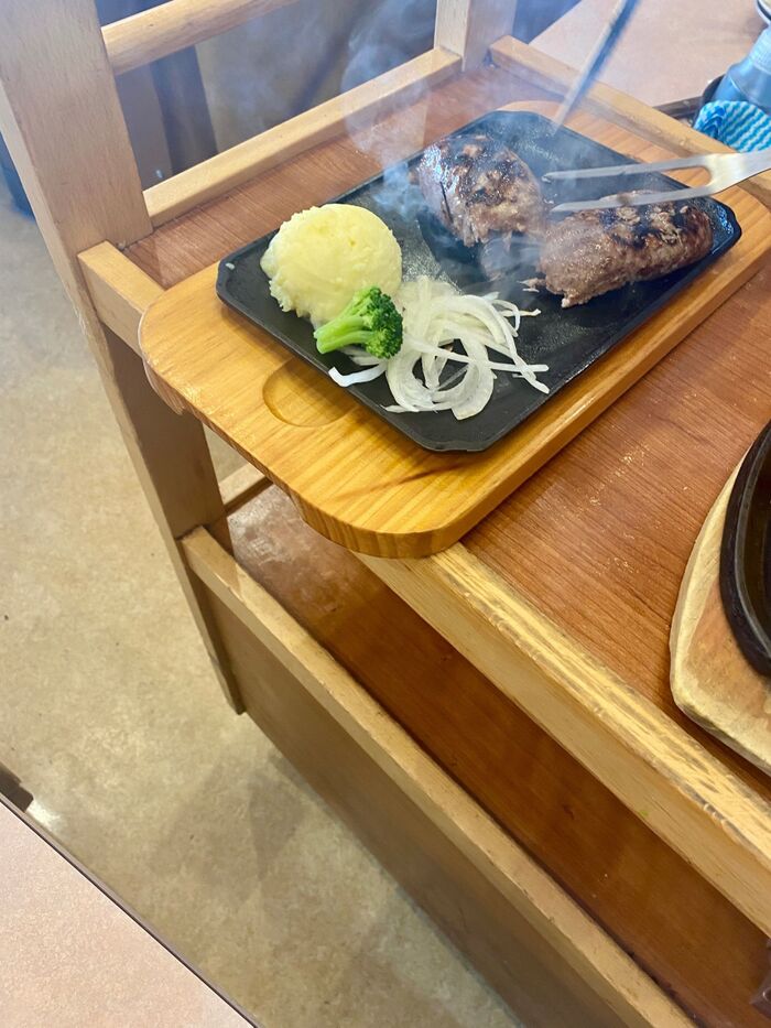 お店の方がテーブル席に運んできて、厚みのあるハンバーグを目の前で横から2個にカットしますよ。