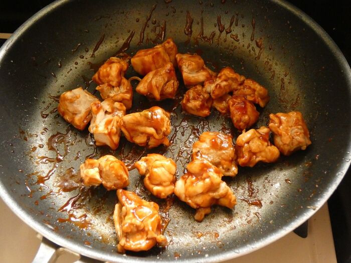 肉をフライパンに戻します。ケチャップとソースを入れ、軽く炒めて全体に味が絡んだら完成。