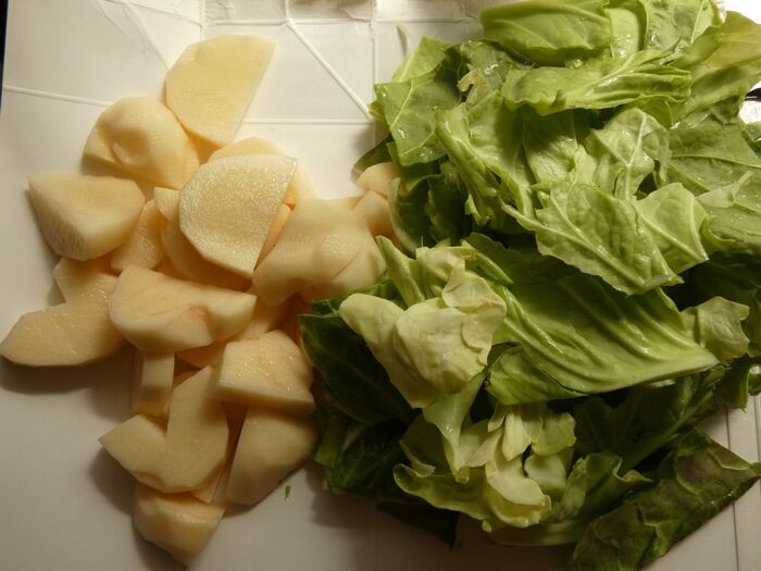 キャベツはざく切りにし、じゃが芋は1cmの厚さの半月切りにします。