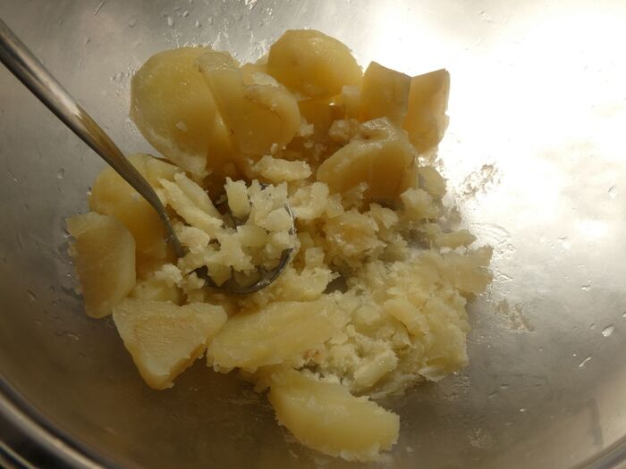 じゃが芋はつぶして、マヨネーズとコンソメ、ドライパセリと塩こしょうで味つけします。