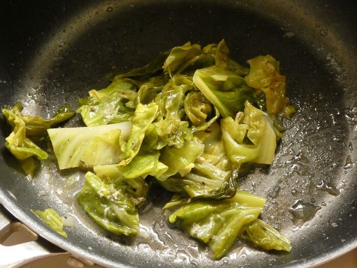 キャベツは塩こしょうとドライバジルで味つけして取り出します。