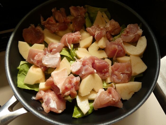 フライパンにキャベツ、じゃが芋、鶏肉の順に入れます。水を入れたら蓋をし、中火で15分くらい火にかけます。