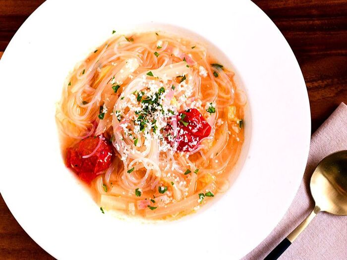 ツルっとした食感の春雨に、トマトの旨味とにんにくの香りがギュッと詰まったスープ。白菜にスープが染み込み絶品の一品。