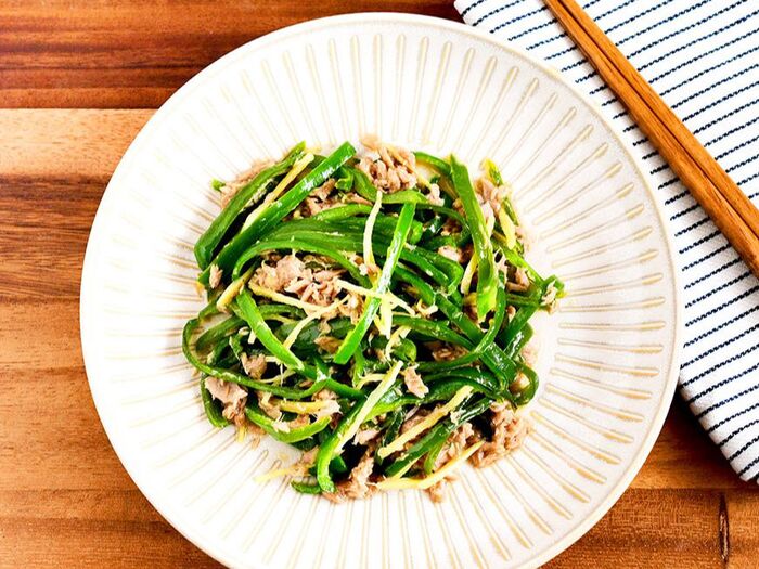 さっと作れるピーマンとツナの炒め物。生姜の香りと万能おだしの旨味が合わさり、箸が止まらなくなるおいしさです。