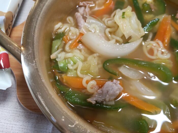 野菜炒めを入れたからか、お汁もすべて飲み干したくなるほど美味しい感じになりましたよ!このインスタント麺はリピ決定です!
