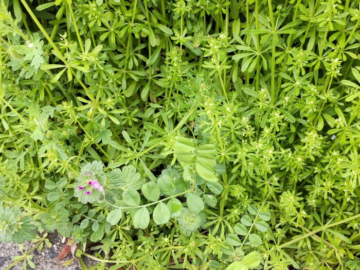 ホトケノザ(画像の紫色の花が咲いているもの)と混じって競い合うように茎を伸ばしていましたが、ホトケノザも「ヤエムグラ(八重葎)」にはかなわないようです。