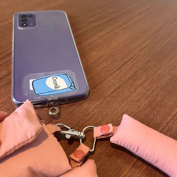 スマホにつけたい時は、別売りのスマホストラップシートにキーホルダーを引っかかるだけ。