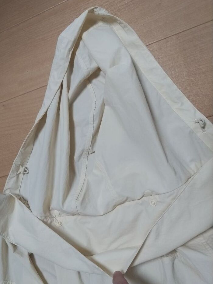 襟元には、パーカーが収納されています。自転車で買い物の帰り小雨に降られましたが、パーカーとこのシャカシャカ生地のお陰で風邪ひくことなく過ごせています。